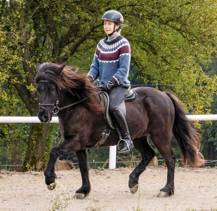 Ragna ist eine sehr kompakte, aber eher kleine Rappstute mit viel Mähne und Schweif. Sie hat vier sehr gleichmäßige Gänge mit schicker Bewegung, gutem Takt und schöner Form. Dadurch vermittelt sie ihrem Reiter ein tolles Reitgefühl. Neben einer guten Ausbildung in der Bahn ist die Viergängerin eine sehr geübte und sichere Partnerin für Ritte im Gelände. Ragna ist für etwas geübtere Kinder und/oder nicht zu große Erwachsene eine schöne Freizeitpartnerin.